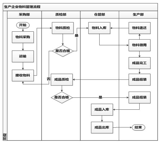 以上物料管理流程描述為:采購部根據企業(yè)的實(shí)際生產(chǎn)需求提前采購物料,物流運輸,接收物料并清點(diǎn),交由質(zhì)檢部門(mén)做質(zhì)量檢測,如存在不合格品交由采購部處理,全部合格后交倉庫入庫,倉管部登記入庫物料數量;生產(chǎn)部根據生產(chǎn)排程情況及物料需求到倉庫領(lǐng)料,庫管登記出庫物料數量;生產(chǎn)部生產(chǎn)加工,加工結束后將成品物料交質(zhì)檢部門(mén)檢測,檢測合格后,交倉庫入庫,庫管登記成品入庫數量;銷(xiāo)售部門(mén)根據銷(xiāo)售訂單從倉庫提貨發(fā)給客戶(hù),流程結束。我們可以看到,整個(gè)物料管理流程涉及多個(gè)部門(mén)協(xié)同工作,是個(gè)有機整體,缺一不可。